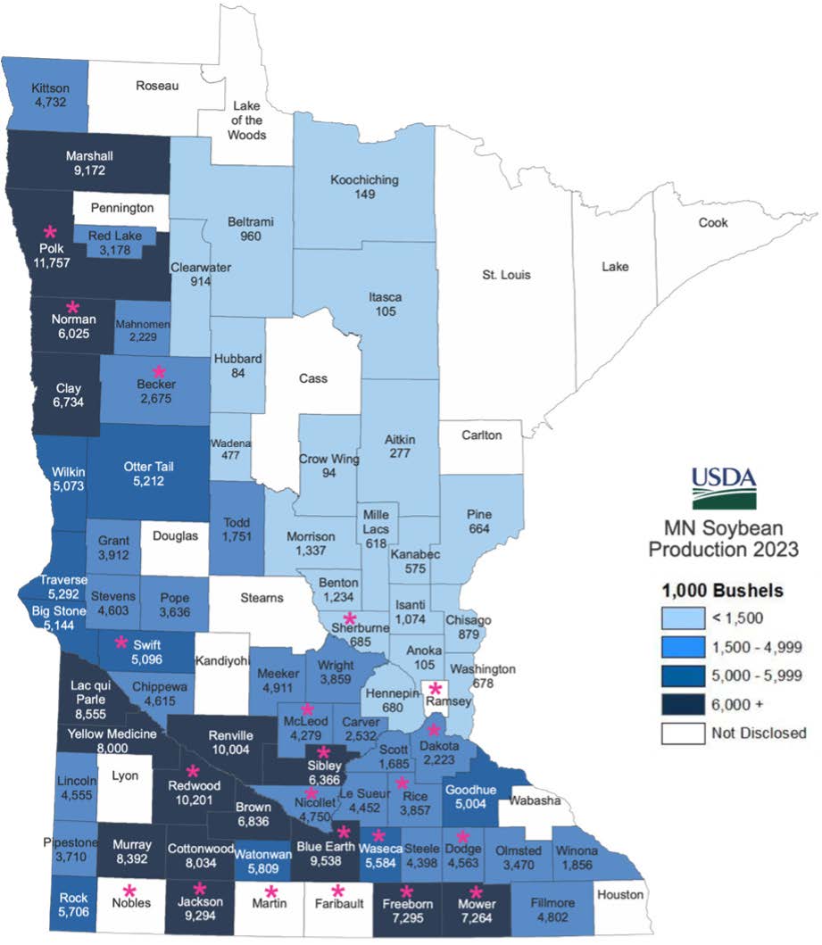 Figure 1. Soil and tissue samples collected from various MN fields in 2023-2025. Pink asterisk represents counties from which we have soil and tissue samples. Map of MN soybean production in 2023, showing number of bushels produced per county (Source: USDA)