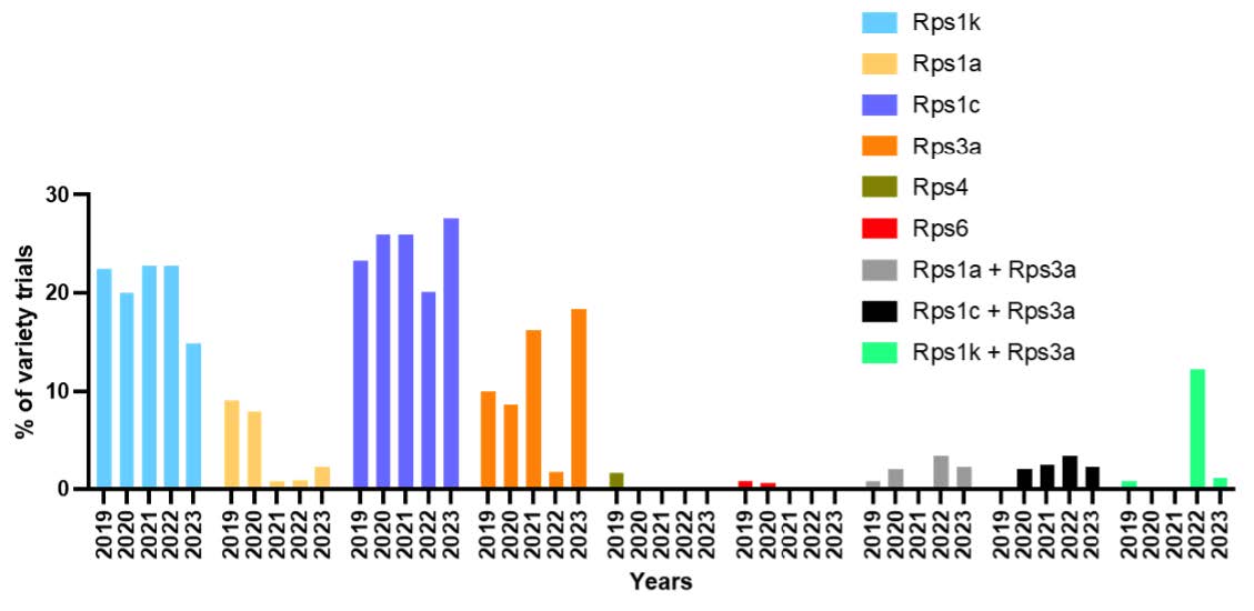 Figure 2. Frequency of Rps genes in the UMN Soybean Crop Variety Trials in years 2019-2023.