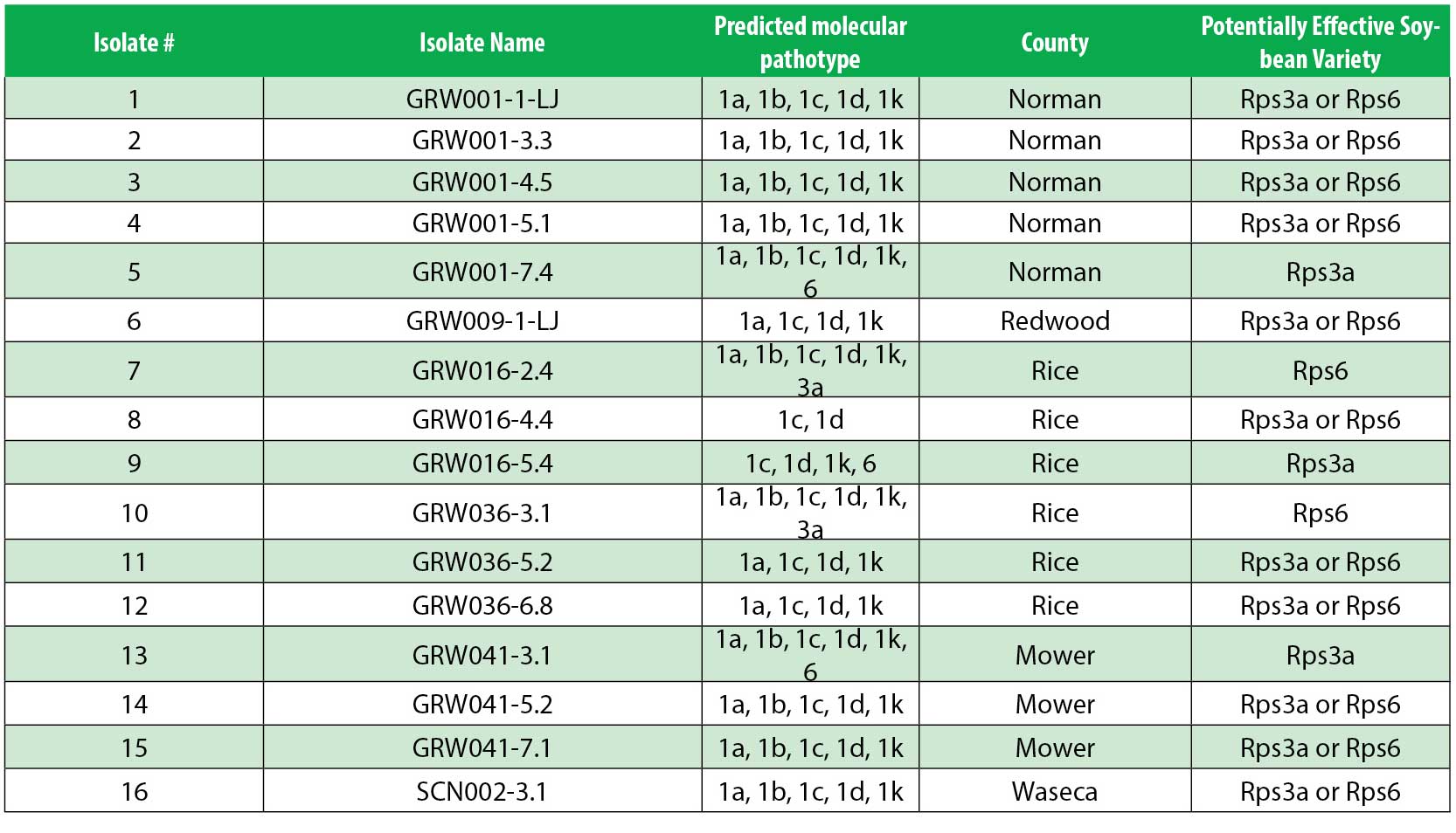 Table 1. Preliminary identification of 16 (of 25) P. sojae-confirmed isolates recovered from soil collected around MN in 2023-2025. There are 6 unique pathotypes across 5 counties thus far.