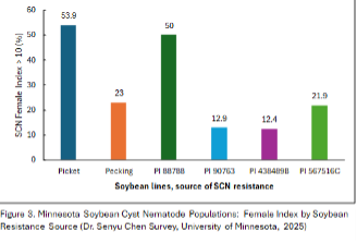 In Minnesota, a statewide effort led by Dr. Senyu Chen evaluated 182 SCN samples collected across soybean-producing regions. Each SCN population (SCN inbred lines) was tested against soybean lines carrying different resistance sources to determine how well current genetics limit nematode reproduction. The results are presented in Figure 3.